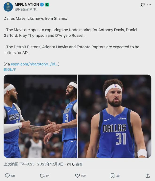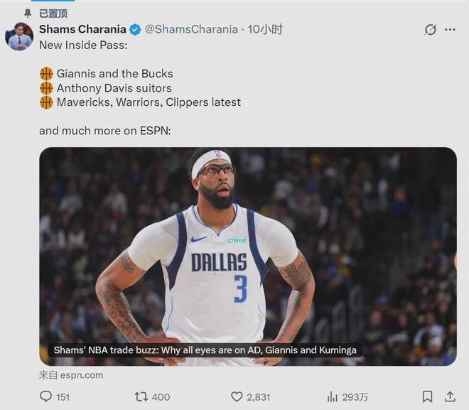 还是Shams的消息,小牛正在权衡浓眉哥的交易价值,看看到底是送走还是续约。