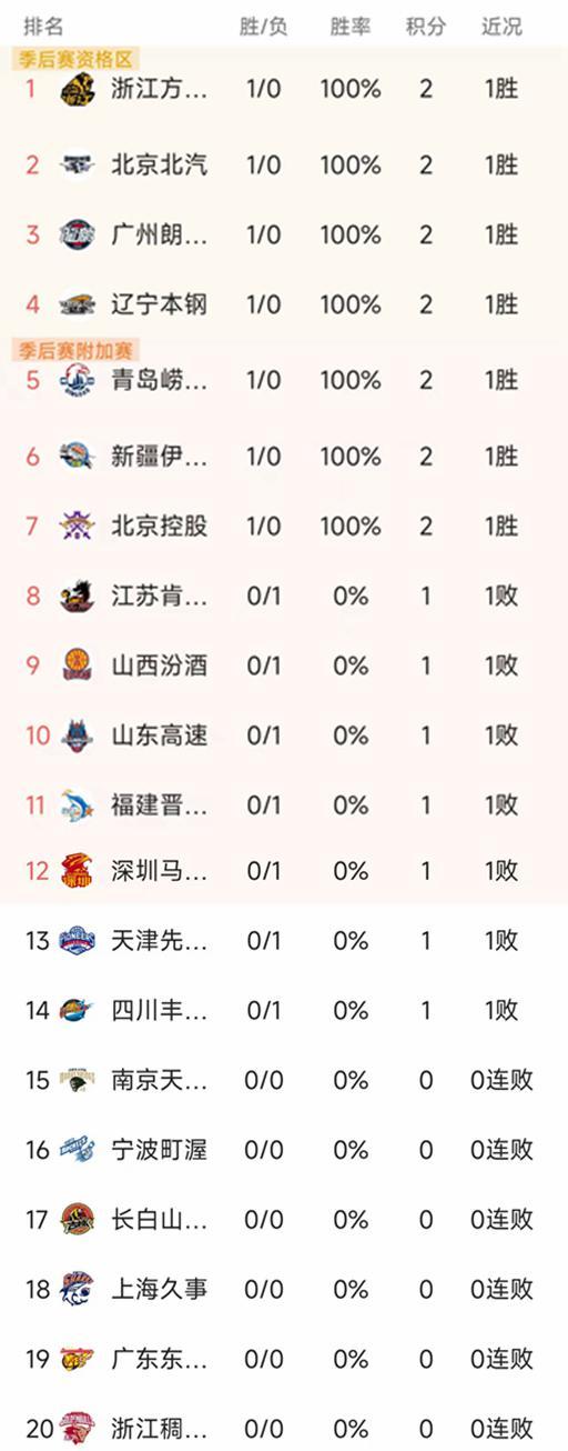 CBA常规赛第一轮结束了7场比赛,最新积分榜如下!
