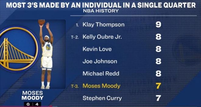穆迪全场三分球12中8,豪取32分,主要的高光镜头都集中在了第一节,首发出场的他单枪匹马扔进7记三分球,单节独得21分,为比赛奠定了基调。如此一来,穆迪也是成为了继库里、汤普森之后,勇士第三位能在单节扔进7记三分球的球员,水花后继有人。哪怕放眼整个NBA历史,穆迪的表现也是现象级的:克莱单节9记三分球独一档,乐福、乌布雷、乔-约翰逊、迈克尔-里德都曾单节投进8记三分球,穆迪和库里并列排在第三档。
